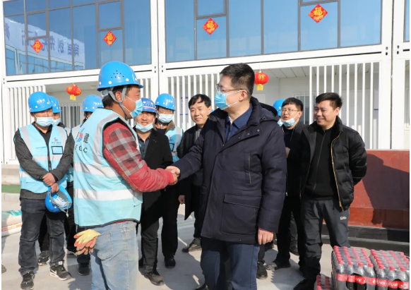延安市委常委、常務(wù)副市長劉曉軍一行來到延安保稅物流中心(B型)項目,深入施工現(xiàn)場,詳細了解了施工現(xiàn)場布置、項目建設(shè)進度、疫情防控措施以及春節(jié)期間工人“就地過年”安排等情況,并向堅守崗位的一線建設(shè)者致以節(jié)日的問候和祝福。