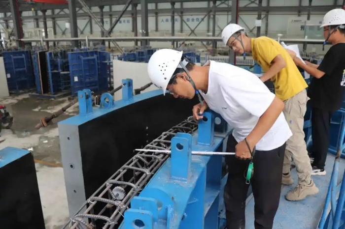 承接任務(wù)后,為確保管片順利澆筑,集團(tuán)新型建材公司統(tǒng)籌部署,科學(xué)組織,嚴(yán)格按照設(shè)計(jì)圖紙、技術(shù)生產(chǎn)規(guī)范要求,對(duì)現(xiàn)場(chǎng)管理人員、勞務(wù)隊(duì)伍進(jìn)行了詳細(xì)的技術(shù)交底,明確了操作規(guī)程;嚴(yán)格把控原材進(jìn)場(chǎng)關(guān),優(yōu)化混凝土配合比,保證管片成品質(zhì)量符合設(shè)計(jì)要求;加強(qiáng)協(xié)調(diào)管控,嚴(yán)格按照施工操作要求完成了模具安裝、鋼筋綁扎、塌落度檢測(cè)、混凝土振搗等工作。